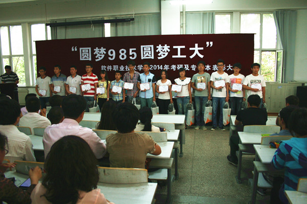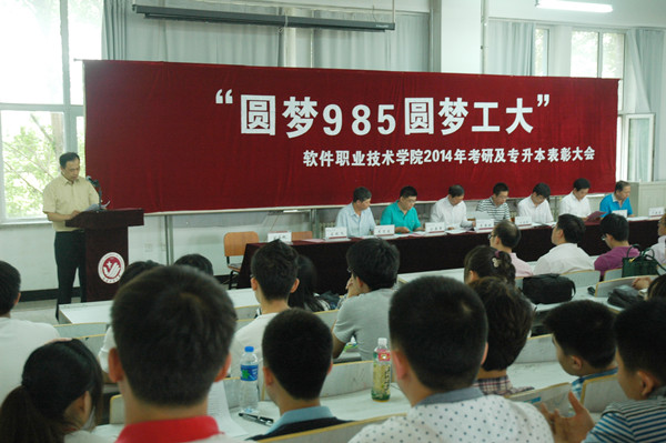 6月11日下午14时,软件职业技术学院在林园校区图书楼201召开“圆梦985 圆梦工大”2014年考研及专升本表彰大会。学校党委副书记李雁冰出席大会,教务处、学生工作处、校团委负责人、软件职业技术学院党政领导和全体教师、部分学生代表参加了大会。会议由学生党支部书记刘永帆主持。