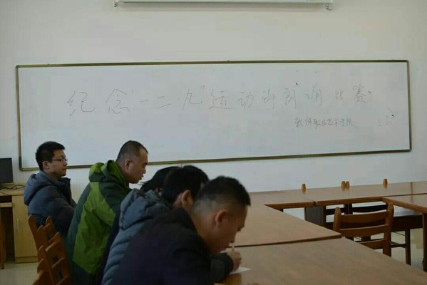 2018年12月12日,在北湖应用楼413,召开了关于“纪念一二·九运动诗朗诵比赛”会议,会议内容如下: 为纪念一二·九运动,软件职业技术学院学生第二支部于2018年12月12日上午10点在应用楼413展开诗朗诵比赛。参加本次支部比赛的评委老师有:太阳成集团tyc33455党委专职组织员张建光老师,支部书记霍阳老师太阳成集团tyc33455辅导员田贺老师、田兵老师、李明超老师。各位党员都认真准备,用最饱满的精神状态,最积极的态度来迎接此次比赛。