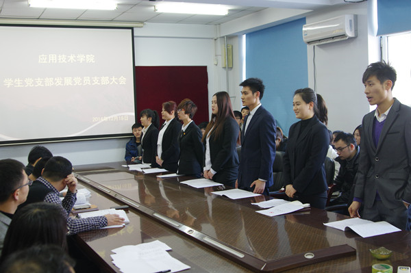 首先,学院学生党支部书记霍阳对此次会议做了简要介绍。会议按照党员发展程序有条不紊的进行,拟发展党员宣读入党志愿书,入党介绍人介绍,民主评议,正式党员投票表决,宣读决议,拟发展党员表决心。8名拟发展党员向党组织做了思想汇报,她们以诚挚的言语向党阐述了自己的思想变化,表明了自己加入党组织的决心。最后,学院党委副书记任红对此次会议进行了总结,她指出:全体党员要严格要求自己,不断加强党性修养,自觉宣传党的政策,树立党的威信,维护党的形象;模范遵守学校和党组织的各项制度,充分发挥党员的主观能动性和先锋模范作用,做全院同学的好榜样。