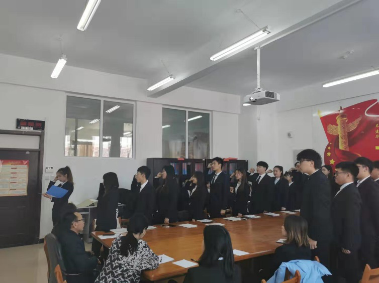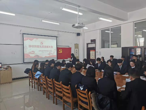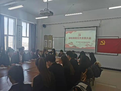 大会第一项是由发展对象依次宣读入党申请书,汇报思想、学习等情况,同学们都真情的表达了对党的向往,表示坚定不移地跟党走,为共产主义事业奋斗终身。大会第二项由入党介绍人介绍邓爽等20名同志的主要情况和培养考察情况。大会第三项是由组织委员谭密宣布支委会对邓爽等20名同志审查意见和结论。两名正式党员国晨曦、贾希对党支部大会讨论的情况表明自己的态度。大会第四项进行无记名投票,计票后宣布大会决议:同意接收邓爽等20名同志为中共预备党员。大会第五项由正式党员贾希带领邓爽等20名同志面对党旗进行庄严宣誓,同志们也向大会表达了自身的想法与决心,不忘初心跟党走,在今后的学习生活中,坚定目标,严格要求自身。