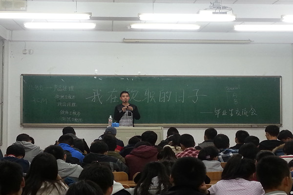 10月24日晚,在林园校区东实验楼3115、3116教室,软件职业技术学院2012届毕业生赵鹏、岳绍敏,2013届毕业生潘强强为学院2014级专科和专升本新生以“我在软职的日子”为主题做了一场的精彩的讲座。
