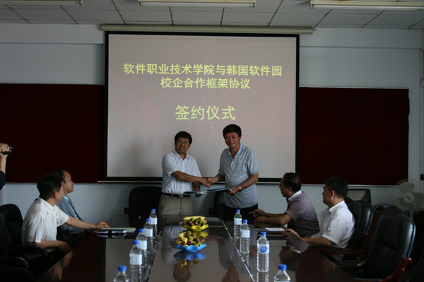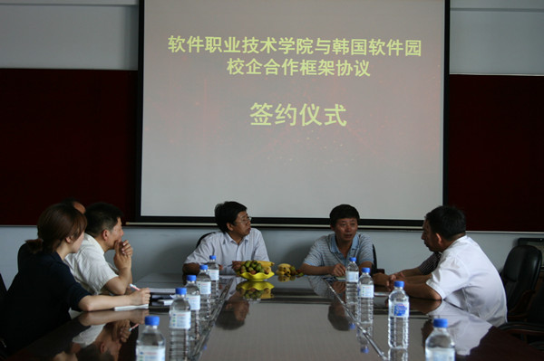 6月19日,在林园校区东实验楼会议室,软件职业技术学院与韩国软件园举行了“校企合作框架协议签约仪式”。软件职业技术学院院长李万龙、副院长于德海、副院长张邦成,韩国软件园总经理张利民、副总经理杜君、技术部导演宋庆春等领导出席了签约仪式。