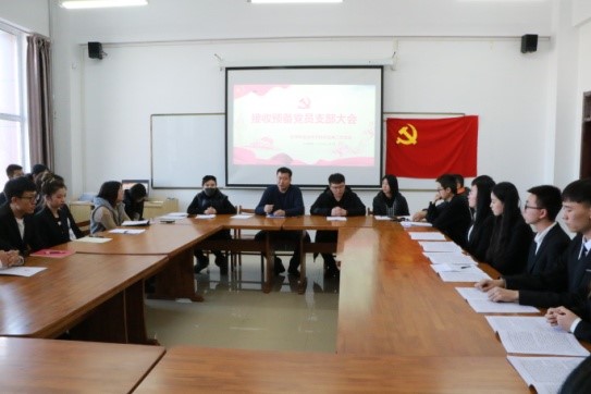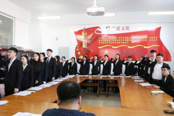 大会第一项是由发展对象依次宣读入党志愿书,汇报思想、学习等情况,同学们都真情的表达了对党的向往,表示坚定不移地跟党走,为共产主义事业奋斗终身。大会第二项由入党介绍人介绍苏本健等19名同志的主要情况和培养考察情况。大会第三项是由组织委员孙可欣宣布支委会对苏本健等19名同志审查意见和结论。两名正式党员韩蛟和包金娜对党支部大会讨论的情况表明自己的态度。大会第四项进行无记名投票,计票后宣布大会决议:同意接收苏本健等19名同志为中共预备党员。大会第五项由正式党员孙可欣带领苏本健等19名同志面对党旗进行庄严宣誓,同志们也向大会表达了自身的想法与决心,不忘初心跟党走,在今后的学习生活中,坚定目标,严格要求自身。