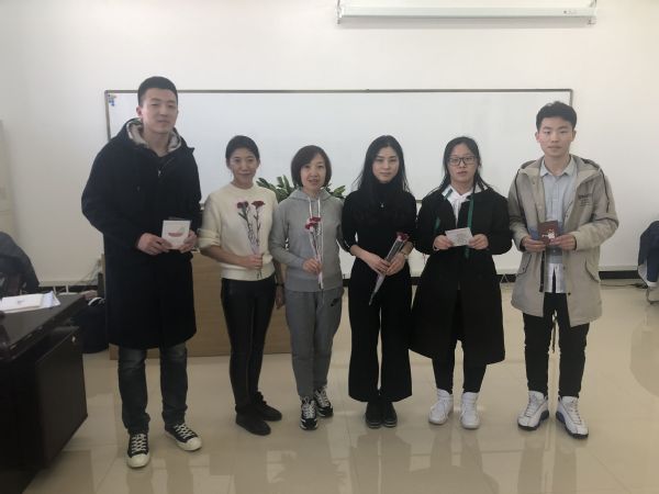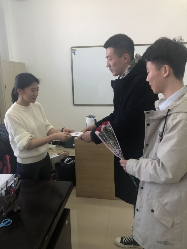 院学生会干部为女教师送来了鲜花和祝福卡。