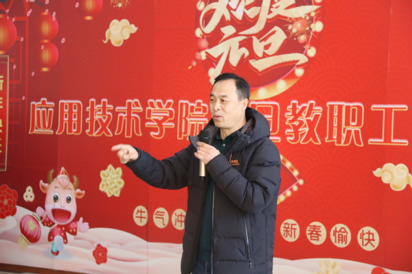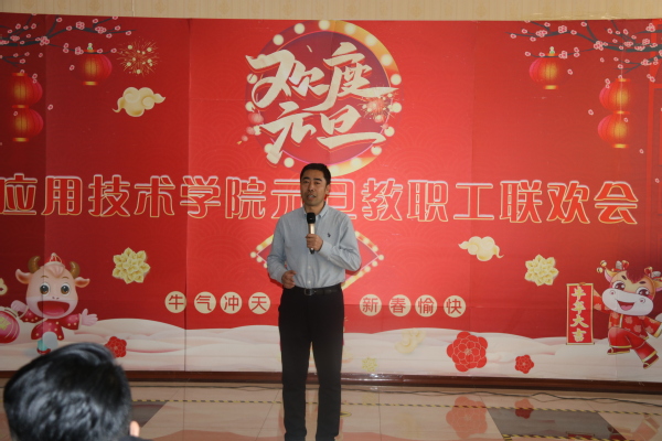 院长王立君致辞,2020年在学院党政班子的团结协作与带领下,各项工作取得了可喜可贺的成绩:学生获得各级各类大赛奖项再创新高,就业工作荣获校贡献单位,学生管理工作在疫情下平稳有序的完成……王立君院长从各教研室、学院办公室、学生工作办公室等几个方面总结了一年来的各项事宜,向全体教职工一年来的辛勤付出表示感谢,并祝福全院师生在新的一年里牛气冲天,万事胜意。