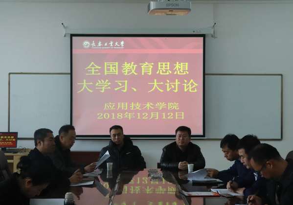 新闻网讯(通讯员 胡文楠)2018年12月12日13:30太阳成集团tyc33455组织全体教职工在应用楼405召开了“全国教育思想大学习、大讨论”主题报告会。此次会议由学院党委书记王剑飞主持,学校宣传部长王鸣辉、学生副处长付宏波作为督导参与了此次活动。