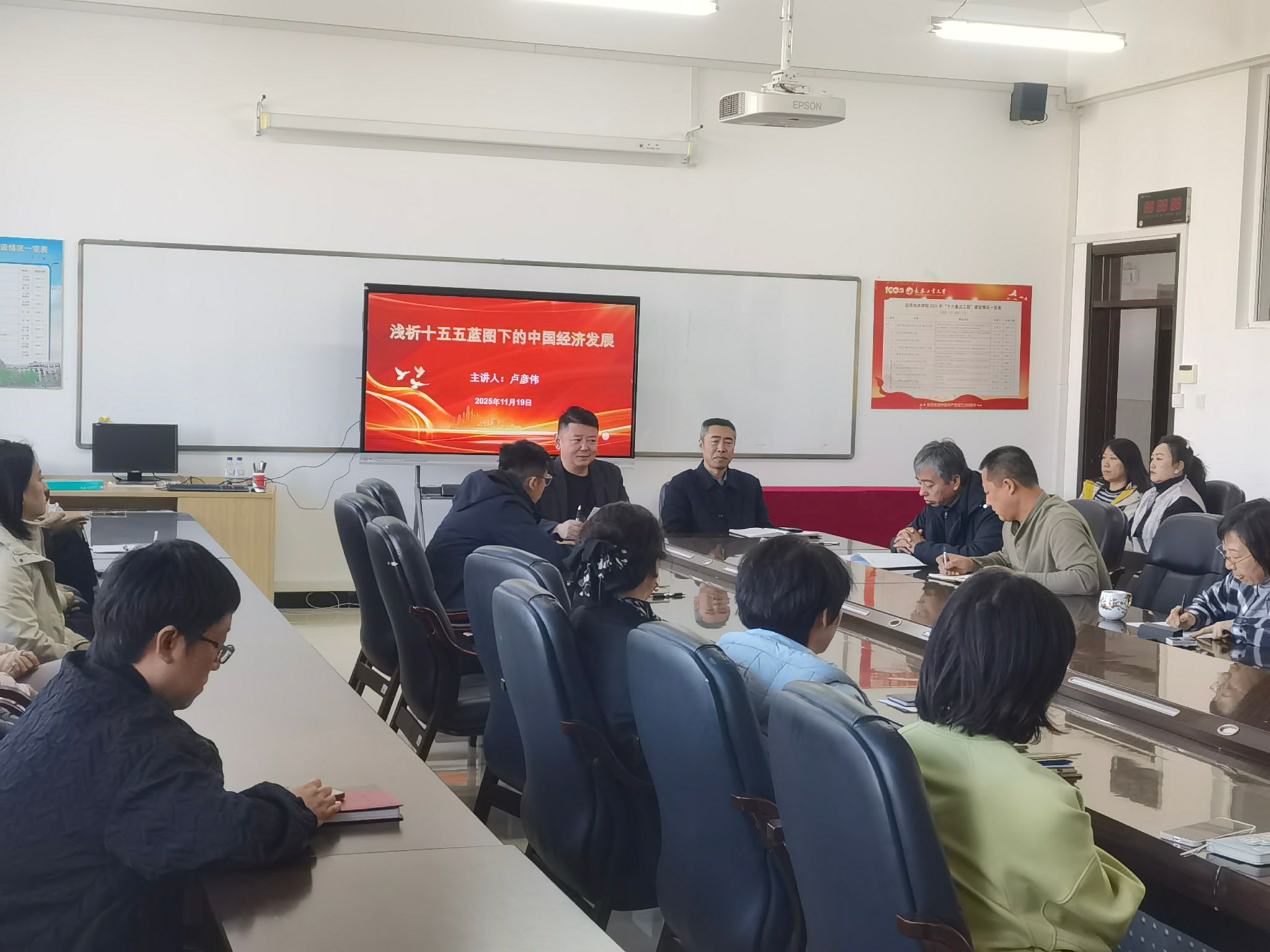2025 年 11 月 19 日下午 14 时,太阳成集团tyc33455党委书记卢彦伟在应用楼 405 室为全院教职工讲授《浅析十五五规划蓝图下的中国经济发展》专题党课,解读二十届四中全会公报精神与十五五规划蓝图。党课紧扣 “未来 5 年中国经济发展” 核心主题,从发展环境、重点任务、民生保障、国家大义等多维度展开,为全体教职工明晰时代方向、把握发展机遇提供了深刻指引。