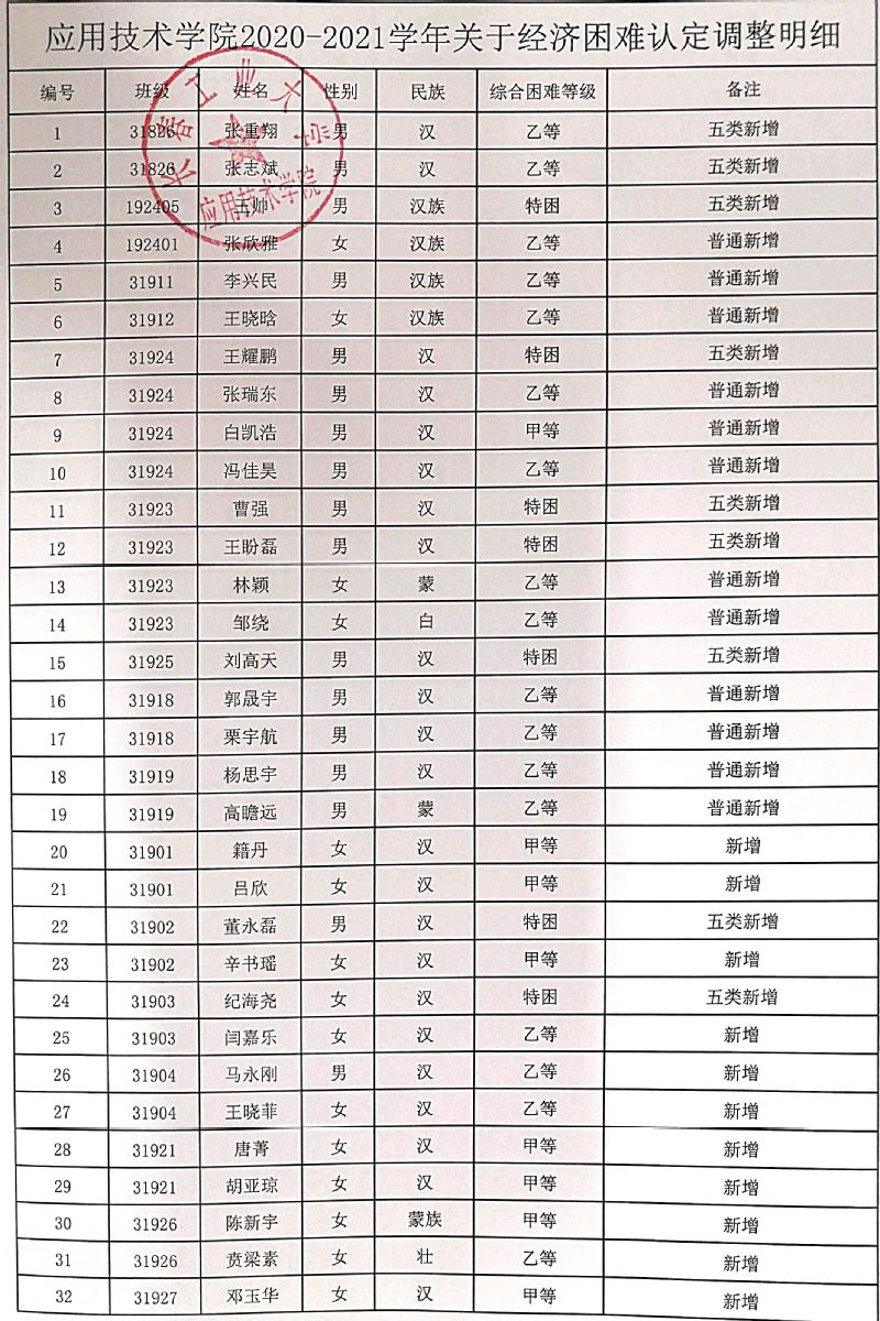 附件1:太阳成集团tyc334552020-2021学年关于经济困难认定调整明细