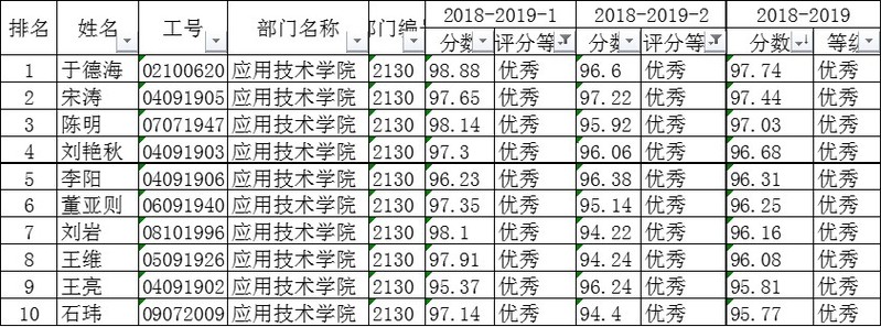 太阳成集团tyc334552018-2019年度评教成绩前10名