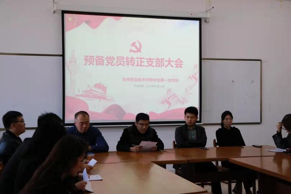 2019年10月21日,软件职业技术学院学生第一党支部在学院党员活动室召开支部党员大会,讨论史谕泽、张迪两名同志预备党员转正事宜。会议由学生第一党支部书记孔若冰主持。